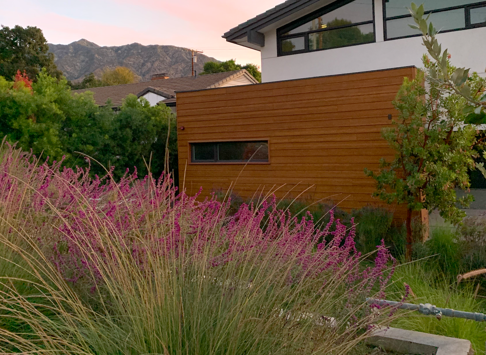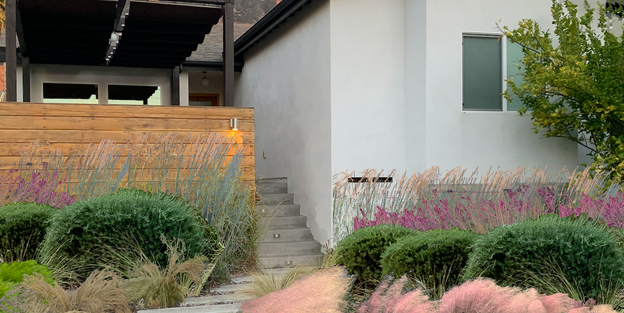 Gorgeous ornamental grasses give a smooth look in spring and a show-stopping performance in fall. The dramatic cycle is a welcome mark of the seasons in a climate where autumn leaves are often late on arrival. Fall-blooming native grasses front this subtle blend of forms and blue, green and gold foliage colors. Lemon and olive trees provide shade and elegance. A perfect compliment to Modern hardscape features. Choose a more minimalist design with ʻ White Cloudʼ muhly grass and succulents. Or go electric with ʻPink Mistʼ Muhlenbergia, Mexican bush sage and Acacia cognata ʻ Cousin Ittʼ.