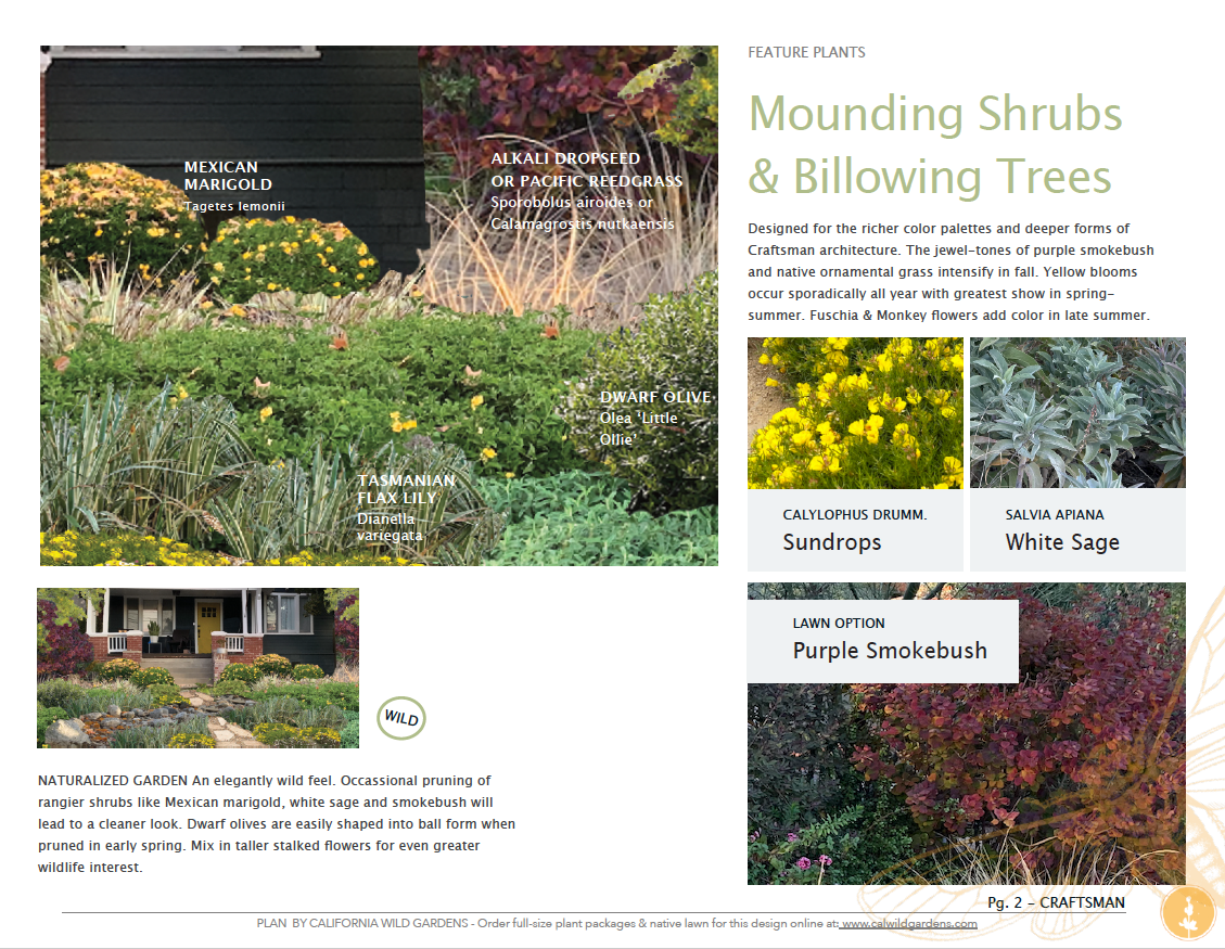 All Trees & Shrubs: Santa Barbara Daisy 'Spindrift', Variegated flax lily, Groundcover Manzanita 'Pacific Mist', Sundrops, Monkey Flower 'Fiesta' or 'Jelly Bean', White Sage, Dwarf Olive & Mexican Marigold + White Sage, Purple New Zealand Flax, Alkali Dropseed (or Purple Three Awn depending on availability), Purple hopseed, Purple Smoke Bush, Palo Verde Tree (standard form)