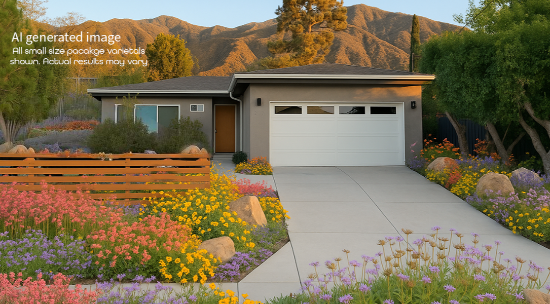 Medium (300 sq.ft.): Penstemon, Island Coral Bells, Creeping Purple Sage, Sundrops, Red Buckwheat, Santa Barbara Daisy + Yellow Monkey Flower, Woolly Blue Curls, Groundcover Manzanita, Bush Poppy or Coast Sunflower, Purple Wild Lilac (ceanothus),