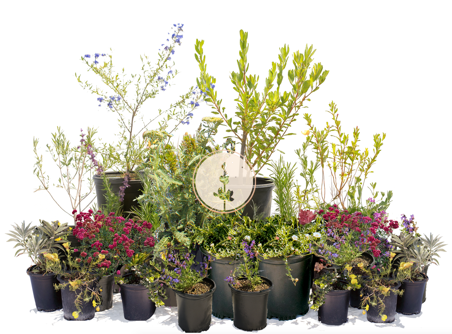 Large (600 sq.ft.):  Penstemon, Island Coral Bells, Creeping Purple Sage, Sundrops, Red Buckwheat, Santa Barbara Daisy, Yellow Monkey Flower, Woolly Blue Curls, Groundcover Manzanita, Bush Poppy or Coast Sunflower, Purple Wild Lilac (Ceanothus) + Black Sage (salvia mellifera), Western Redbud, White Sage, Toyon 'davis gold', Matilija Poppy or Bush Lupine*