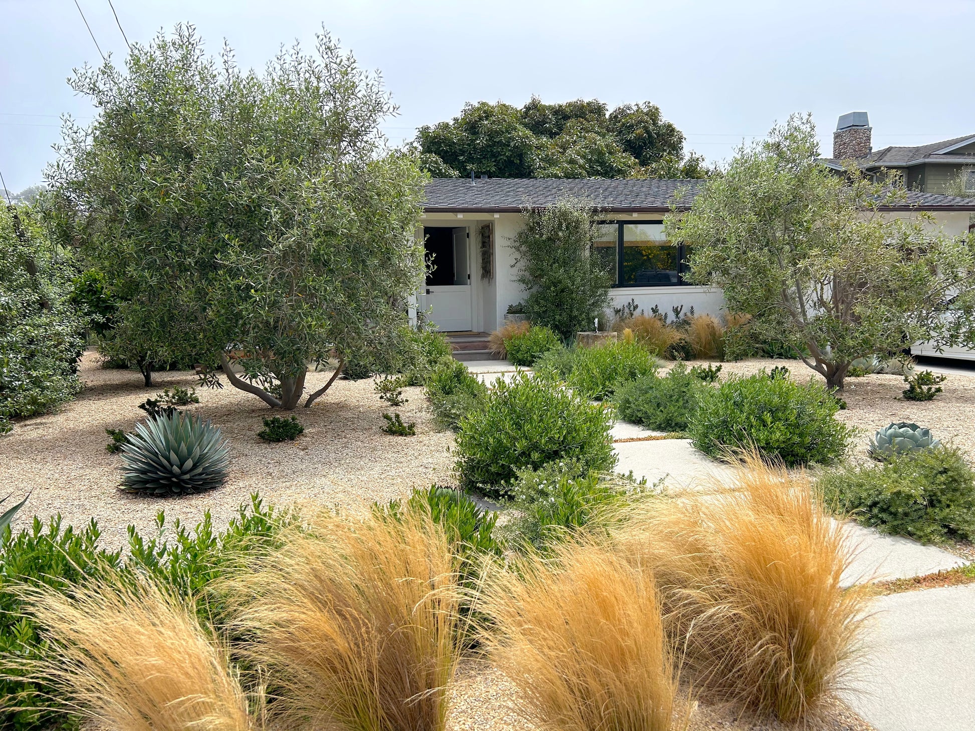 Collection of fine grasses, low-water mediterranean shrubs, olive trees  & coastal breeze-loving specimens for Los Osos